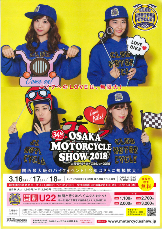 東京より一足先に行なわれる第34回 大阪モーターサイクルショー2018は、3月16日(金)から18日(日)までの3日間の開催です。