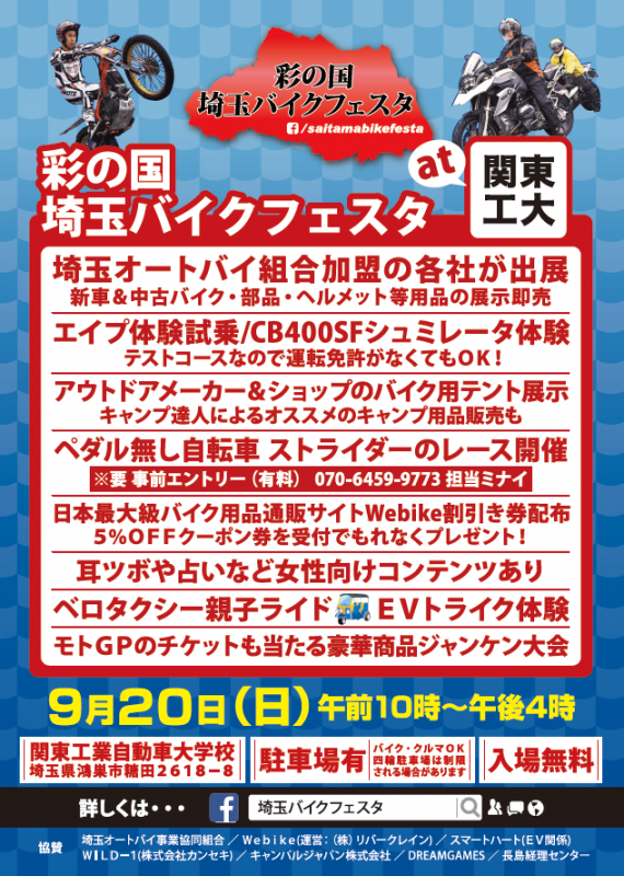 新車中古車の展示販売をメインにバイク用品やパーツの展示販売、免許が無くても乗れるエイプ試乗体験、EVバイク&モビリティ体験、バイク用テントの展示販売、耳ツボや占いなどの女性向けコンテンツ、お子様に人気のストライダーのレースを開催します。
