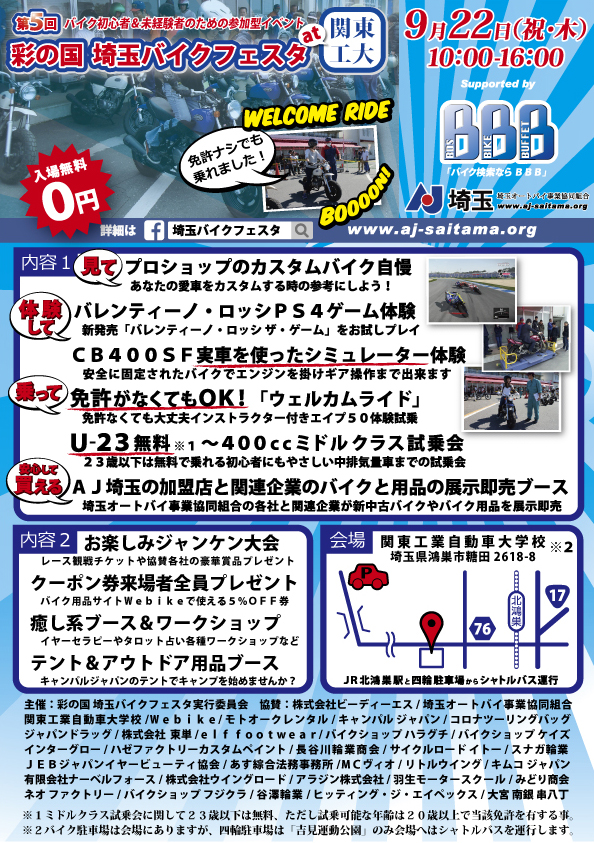 過去2年間で3,000人が来場した「彩の国 埼玉バイクフェスタ」ですが、来たる9月22日(祝・木)に第5回を開催します。