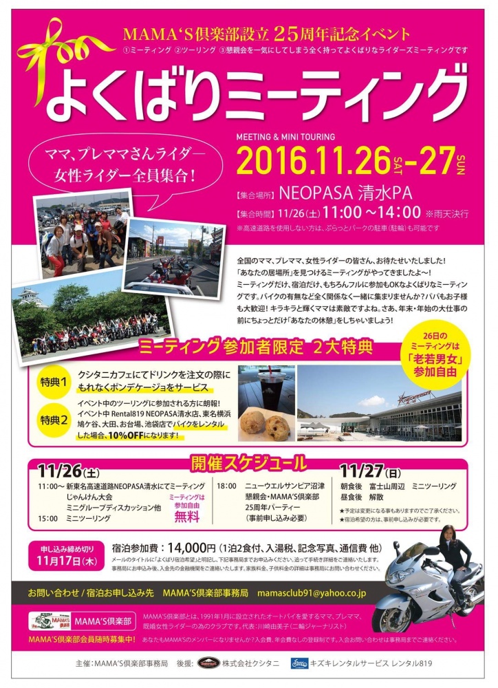 設立25周年を迎えるMAMA’S倶楽部の記念イベントとして、多くのママ&プレママや女性ライダーのために”あなたの居場所を見つけるよくばりミーティング”と題したミーティングを開催。ミーティングだけ、宿泊だけ、またバイクの有無も関係なく、パパ&子供さんも連れての参加もOKという本当に「よくばり」なミーティング。「今は妊娠、出産、育児でまったくバイクに乗れる時間がなかなか取れない・・」という方や、「介護も大変よ!」というベテランママさんなど女性ライダーに取り巻く様々な思いが沢山ありますよね。でもこのミーティングでいろんなママたちとコミュニケーションを取ることにより「あなただけの素敵な時間と友達」を見つけることができるかもしれませんね!倶楽部代表は、LB誌でもおなじみの二輪ジャーナリストの川崎由美子。参加者限定の嬉しい特典あり。ぜひ一緒に素敵な時間を過ごしませんか?