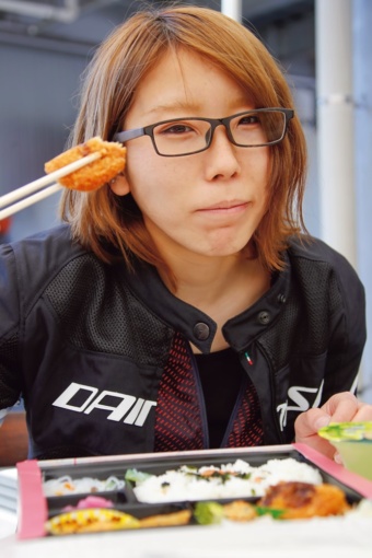 お昼には前田選手とブリヂストンの山田さんのトークショーがあり、その後、戸田選手と青木選手、ブリヂストンモーターサイクルタイヤ代表の佐藤 潤さんが、タイヤの特性や選び方などをわかりやすく教えてくれました。続いて、ブリヂストンのキャップをゲットできるゼッケン番号による抽選会も行なわれました。またボリューミーなお弁当も用意されています!