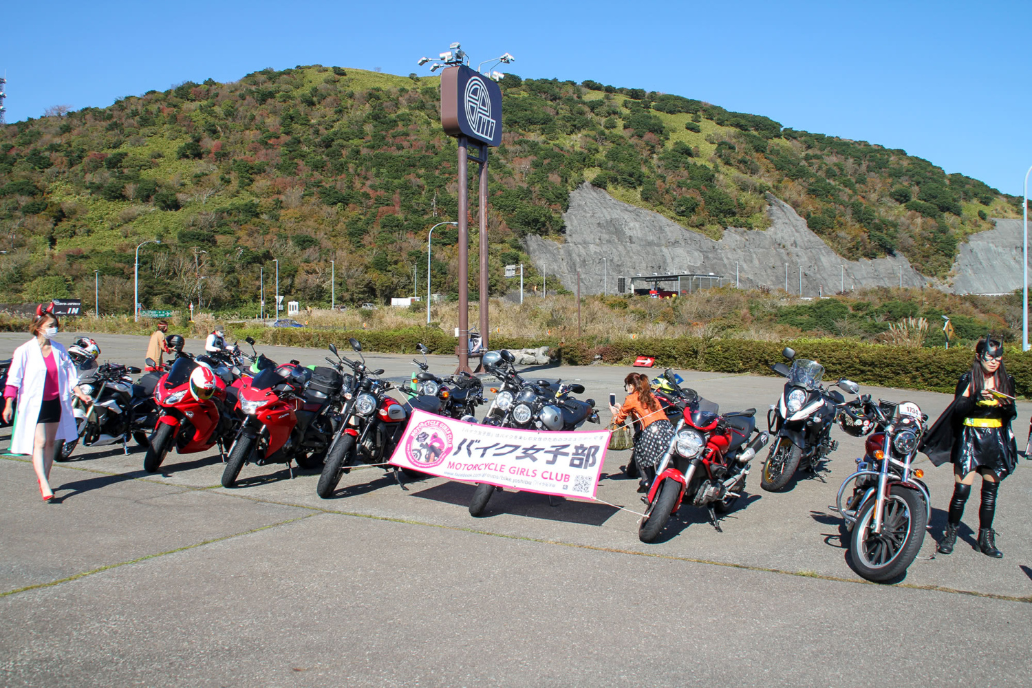 といってもイベントとしてはとくにスケジュールはなく、仮装コンテストをFacebookグループ上で開催することと集合写真を撮ろうか、という程度。急な話だったのでどれほど集まるかも読めず、行ける人が集まりましょう、とゆるーく開催です。それでも“メンバーのバイクは集まって停めたいぞ”とバイカーズパラダイス南箱根の駐車場にバナーを広げ、バイクレディが来たらそこへ誘導しちゃいます。