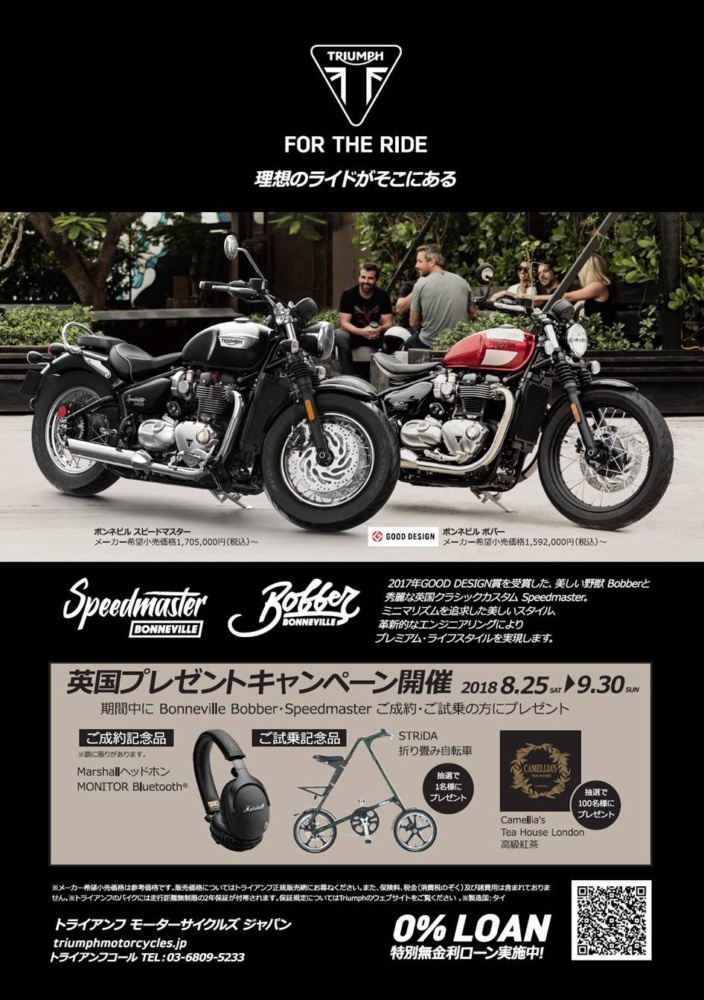 9月30日(日)までに、全国のトライアンフ正規店で対象モデルを成約、または試乗した人に、イギリスに関係する記念品が贈られる “トライアンフ英国プレゼントキャンペーン” が開催中です。トライアンフの本拠地であるイギリスにちなんだグッズに囲まれて、英国の雰囲気をさらに盛り上げてみてはいかがでしょうか?