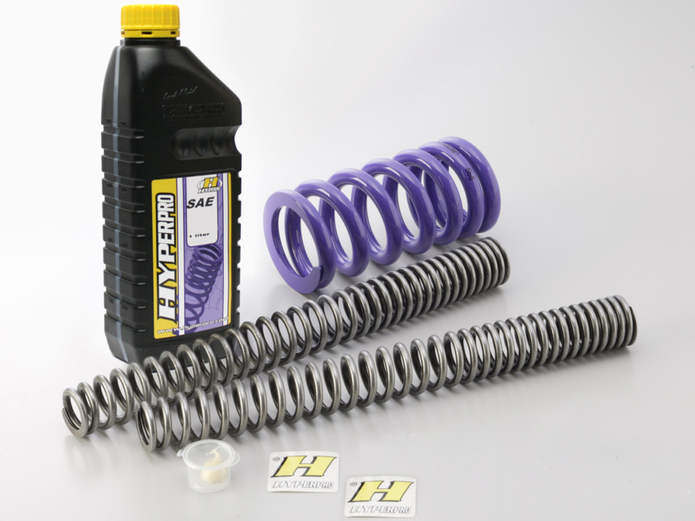 ちなみに、ハイパープロのローダウンスプリングは自由長(いわゆるストロークの量)を犠牲にせずに、スプリングの硬さとフォークオイルの量の調整で車高を下げることを意識しているのがポイント。