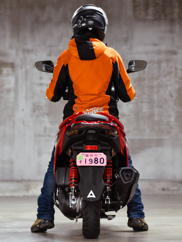 シート高775mmですが、スリムなシート形状で親指付け根までしっかり足がついています。片足だとカカトが5mmほど浮いているような感覚ですが不安感はありません。小まわりが効きくので、駐輪場など狭い場所でも取りまわしの良さに期待が持てます。