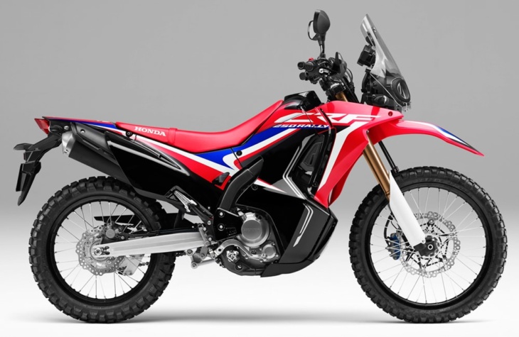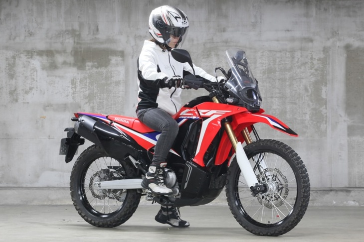 CRF250ラリーのタイプ別でローダウン仕様のタイプLD。取りまわしのため車体を起こすと前後サスペンションがグッと沈み、またがるとさらに沈むので、またがれれば足つきの苦労は少ない印象。ただ、スタンドのスプリングがやや硬いのが気になるところ。慣れていないうちのスタンドの出し入れには注意が必要かも。