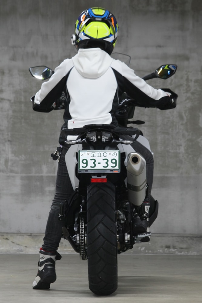 シートの幅は思ったより広く、またシート表皮が滑りにくくなっている。そのためパンツとの相性次第では、またがった状態で左足から右足につき直してのスタンドを出す、といった動作に苦労しそうだ。スタンドも長いので、バランスを取りながらの出し入れには注意したいところだ。