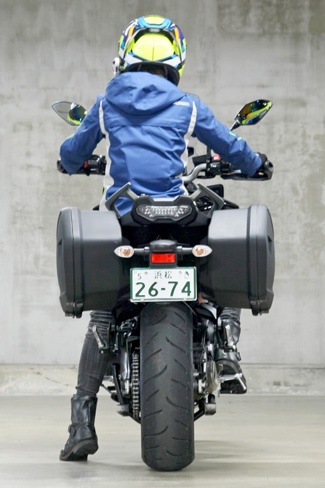 パニア装備しているのもあって、パッと見の大きさから『車体を起こすことすら厳しいのでは?』と身構えていたが、少し反動をつけて車体を起こすようにすれば、バランスをくずすことなく起こすことができた。