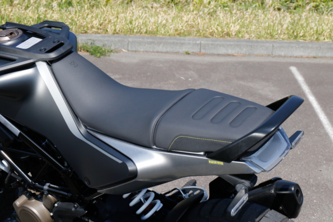 シート高835mmという数値から見るに、155cmのライダーにとっては高く案の定両足は着かない。シートは全体的に細身だがしっかり削られているというわけではないので、足がやや外側に広がる印象だ。