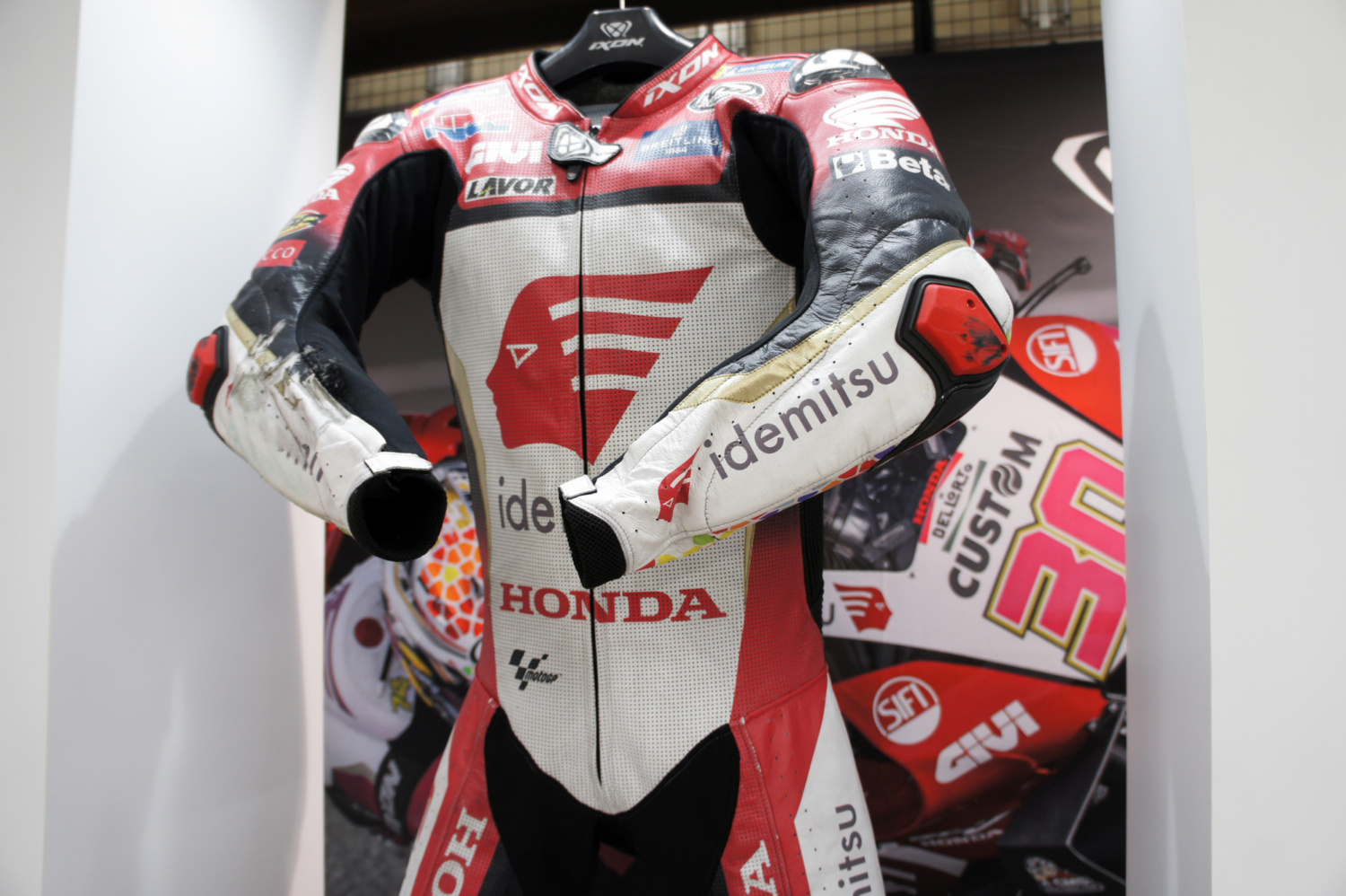 展示されるのは日本で唯一のMotoGPライダーである中上貴晶選手のレザースーツで、実際にカタールGPで着用し、レース中の転倒によって損傷した戦いの傷跡残るレザースーツの実物が観られるというわけだ。