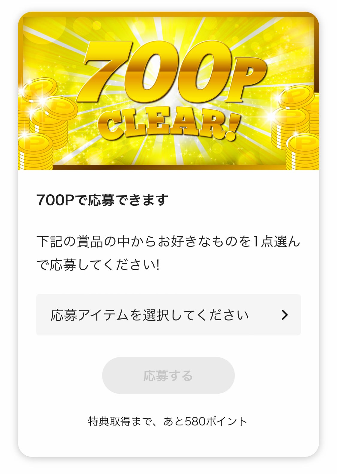 ちなみにポイントを貯めての応募は300Pからだが、ポイントは応募ごとに消費されるのではなく加算されていく。たとえば300Pで応募した後で500Pの応募をするためには通算800Pが必要なのではなく、通算500P、700P、900P、1100Pと、追加で200P貯めるごとに応募ができるのもうれしい。どんどんポイントを集めていけば応募回数も増えて当選確率も上がるという寸法だ。ぜひ活用いただきたい。