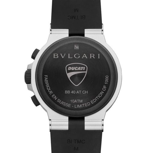 ケースはアルミ製で、リューズとクロノグラフのプッシャーはDLC(ダイヤモンド・ライク・コーティング)が施工されたチタン製。ラバー製のベゼルにはブルガリ・ブルガリのダブルロゴがあしらわれ、アイコニックでデザイン性の高いしなやかなストラップがセットされている。