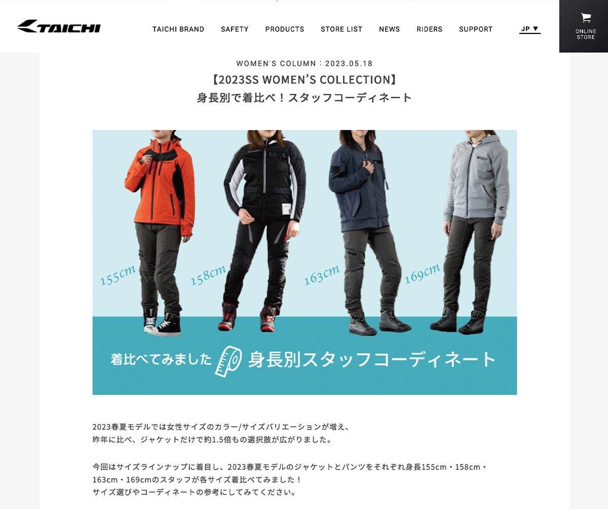 その結果、活動がスタートして以降WEBページには女性特集が組まれるようになったし、2023年春・夏コレクションは、女性向けジャケットのサイズやカラーが2022年にくらべて1.5倍になっている。さらにWEBページで展開しているWOMEN’S COLUMNには9本の記事がアップされ、22AW WOMEN’S特集ページのモデルを務めたYUさん(@yu.sr500)やTAICHI女性スタッフがツーリング時に持っていくバッグの中身を紹介したり、最新の女性向けウエアをサイズ別やカラー別で紹介したりと、女性目線ならではのコンテンツで、女性ならきっと共感できるはずだ。そんなわけで、この先“TAICHI womenUP”プロジェクトから、どんなアウトプットがあるのか女性なら要注目だ。